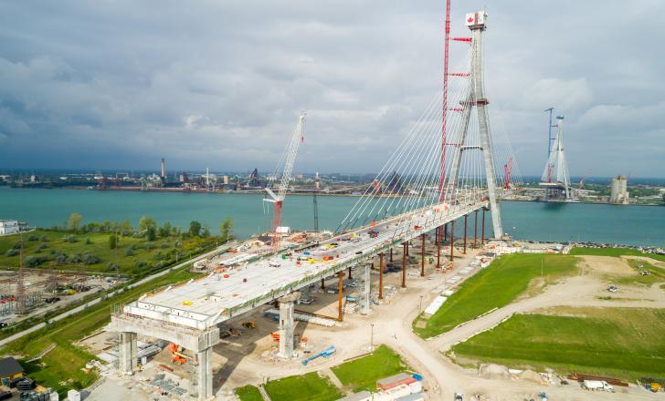The six-lane cable-stayed bridge project includes new customs plazas in both Detroit and Windsor as well as a new link to the I-75 interstate highway in Detroit.