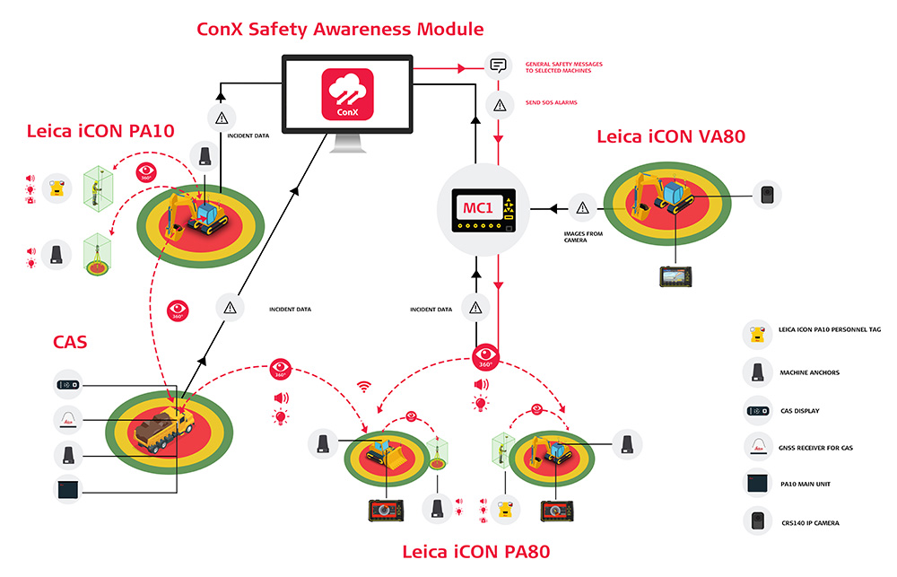 Adopting the technology and frequent training helps pedestrians, machine operators, and office personnel to increase safety awareness on-site and minimize incidents. The Leica ConX Safety Awareness Module uses the existing Leica ConX cloud infrastructure to collect data and alerts generated from the Leica iCON PA10, iCON PA80, and CAS solutions. Site managers have a complete overview of incidents and potential incidents. Measuring and analyzing the data will further improve the level of safety over time as it helps to avoid similar situations in the future.