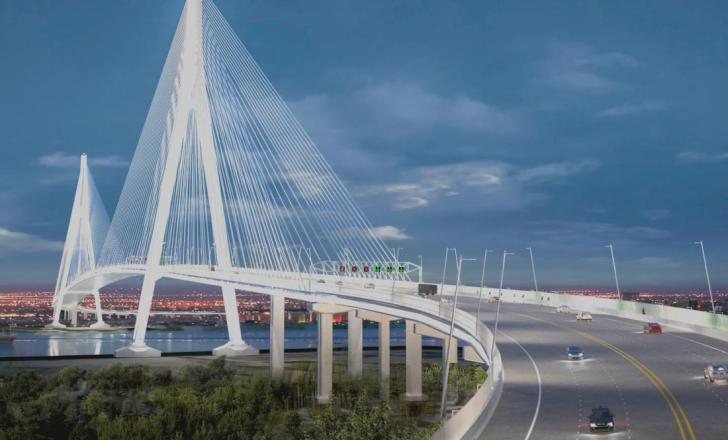 Early work for the bridge started in summer 2018 and when completed, it will be the longest cable-stayed bridge in North America. The longest span stretches 853m completely over the river and clearance above water will be 42m. The Canadian government will receive all toll revenues, the project being totally Canadian with no US funding.