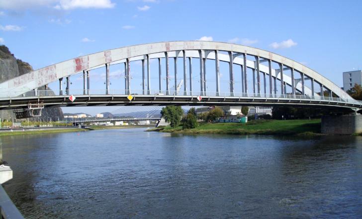 The 9.2m-wide steel arch through bridge was built between 1934 and 1936 was the town’s second bridge over the Elbe. It was the first bridge in what was then Czechoslovakia to be composed of two hollow concrete girders (height 12m, span 114m) with suspended bridge deck. It was also Czechoslovakia’s first reinforced concrete bridge with a span of over 100m. It has an arch rise of 12m above the deck.