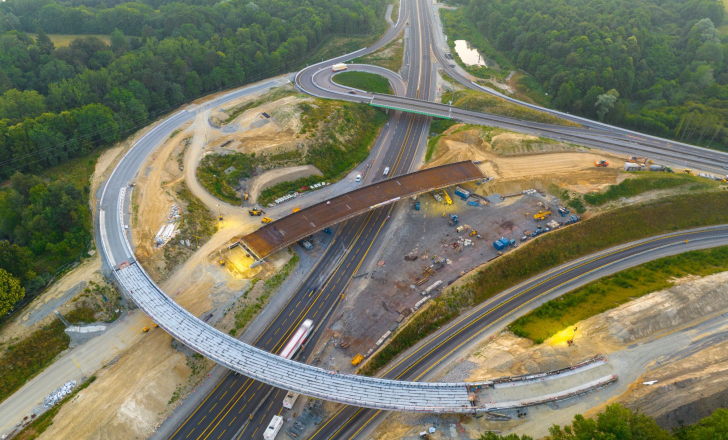 Next, it was time to jack-and-pack the 740-tonne curved bridge, jacking it from 1.5m to 4m high. From there, the CS450s took over. Positioned on top of the SPMTs, they lifted the bridge at an angle of 5% along its width for transporting it over 70m of highway. Finally, the crew jacked it down 2m onto its final supports – all within the brief six-hour timeframe.