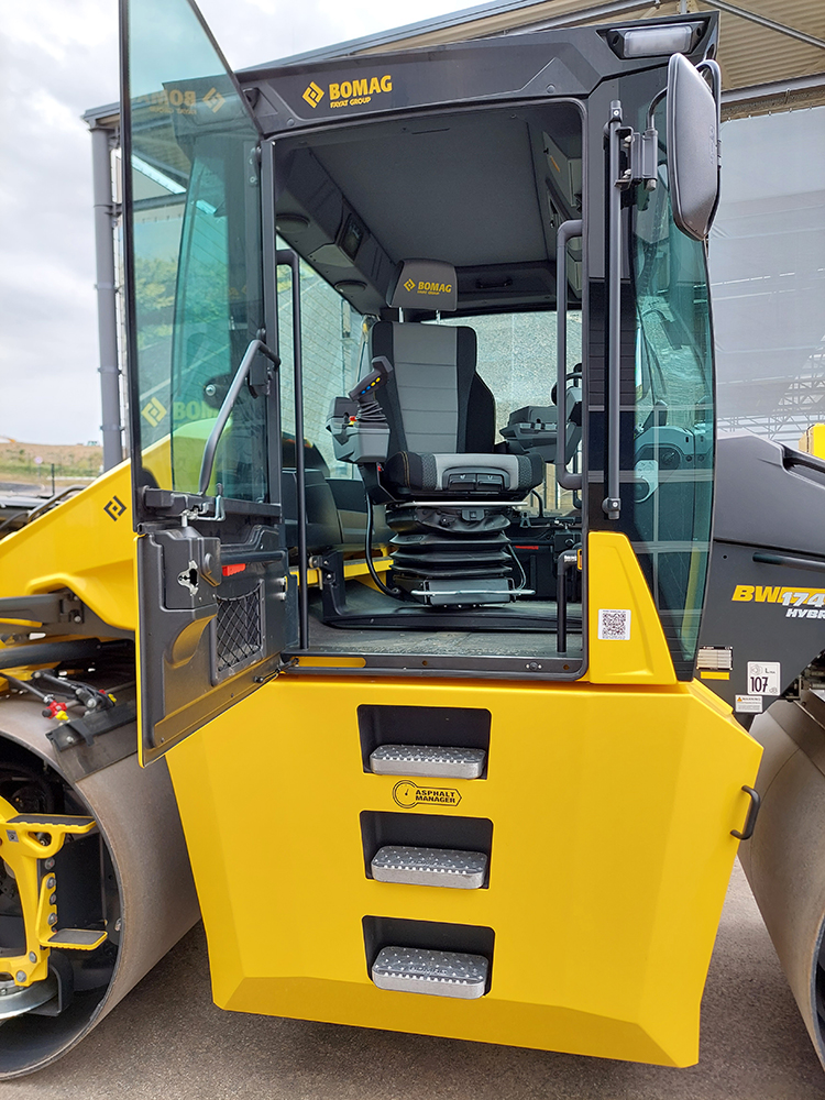Back-friendly work starts with getting on and off the machine: among other features, the BW 154 AP-5 and BW 174 AP-5 pivot-steered tandem rollers have two extended handholds, three sufficiently deep, non-slip steps and an increased door opening height. This makes climbing on and off safely and upright without slipping or hitting your head easy, even several times a day.